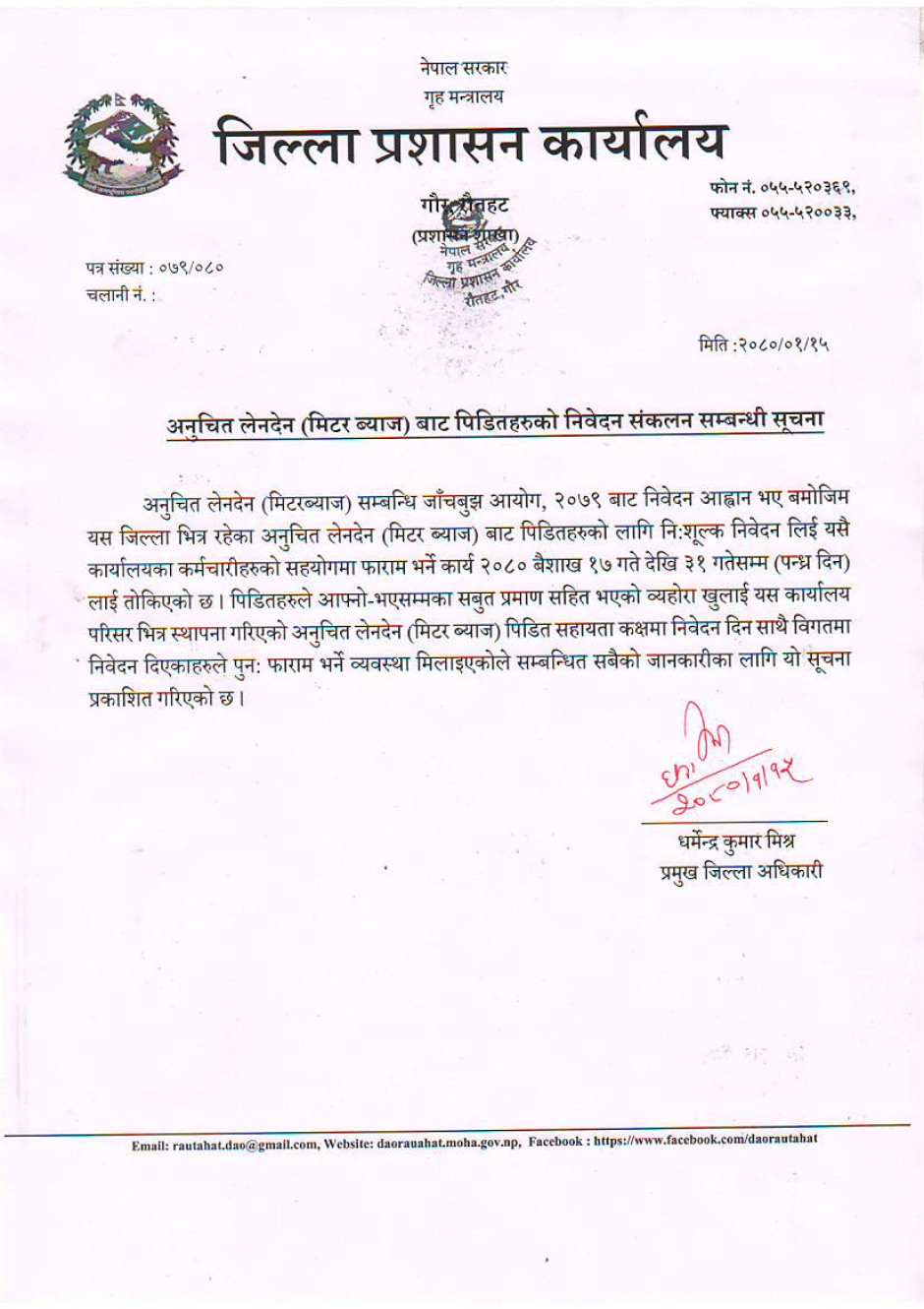 जिल्ला प्रशासन कार्यालय रौतहटबाट जारी सूचना
