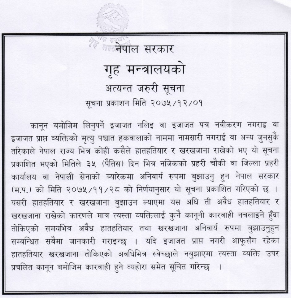 गृह मन्त्रालयकाे इजाजत नलिएका वा नविकरण नगरिएका हातहतियार खरखजाना सुरक्षा निकायमा बुजाउने सम्बन्धी अत्यन्त जरूरी सूचना