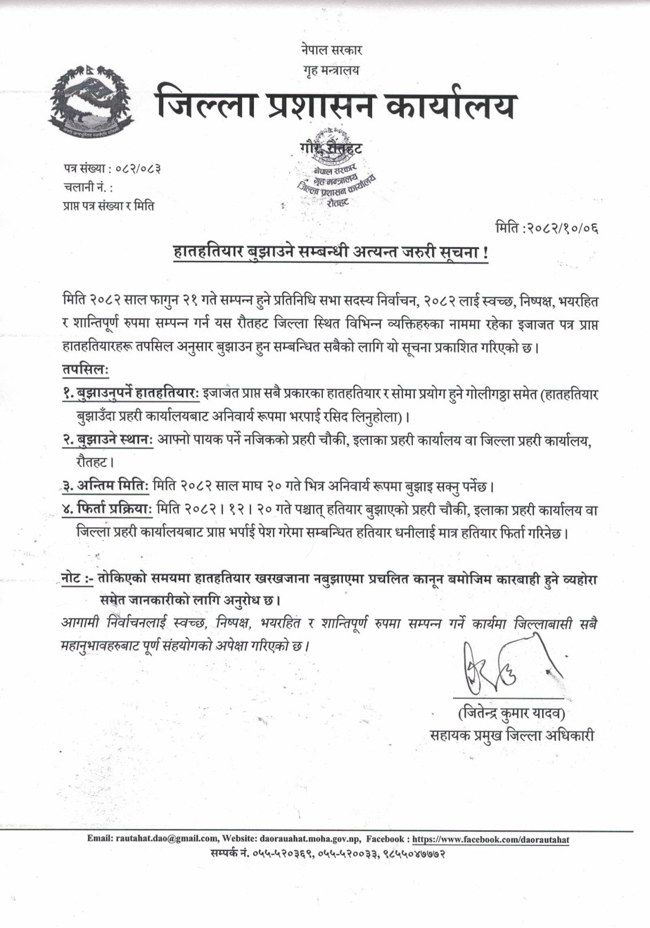 जिल्ला प्रशासन कार्यालय रौतहटबाट जारी सूचना