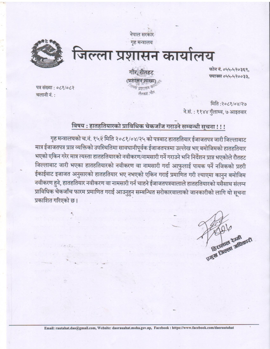 जिल्ला प्रशासन कार्यालय रौतहटबाट जारी सूचना