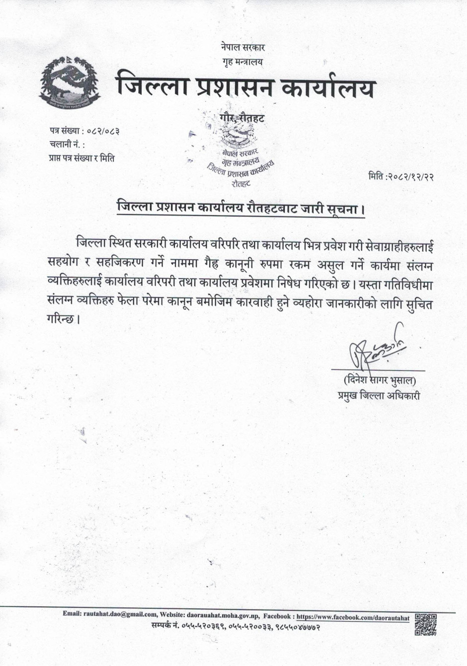 जिल्ला प्रशासन कार्यालय रौतहटबाट जारी सूचना