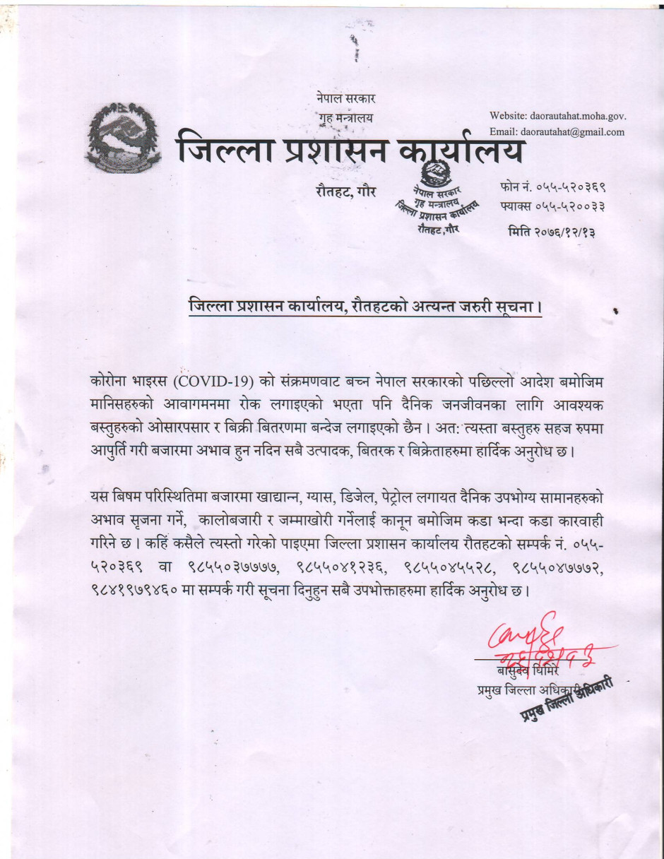 जिल्ला प्रशासन कार्यालय, रौतहटको अत्यन्त जरुरी सूचना ।