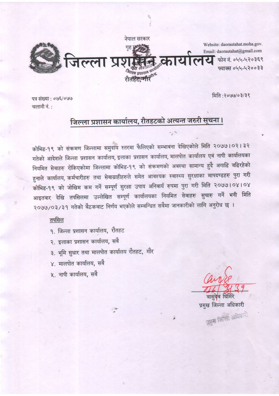 जिल्ला प्रशासन कार्यालय, रौतहटको अत्यन्त जरुरी सूचना
