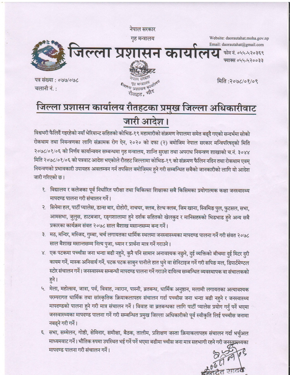 जिल्ला प्रशासन कार्यालय रौतहटका प्रमुख जिल्ला अधिकारीवाट जारी आदेश ।