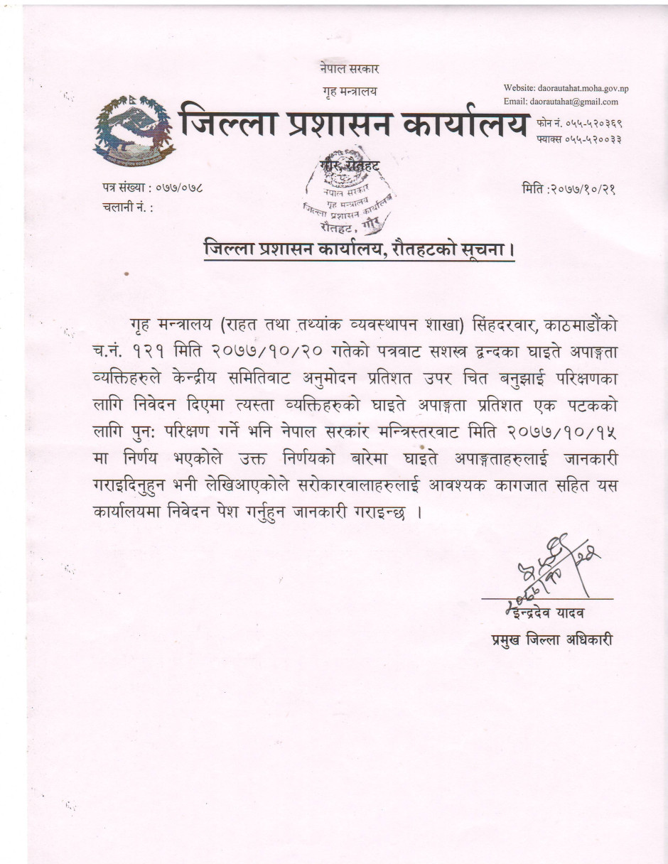 जिल्ला प्रशासन कार्यालय रौतहटबाट जारी सूचना