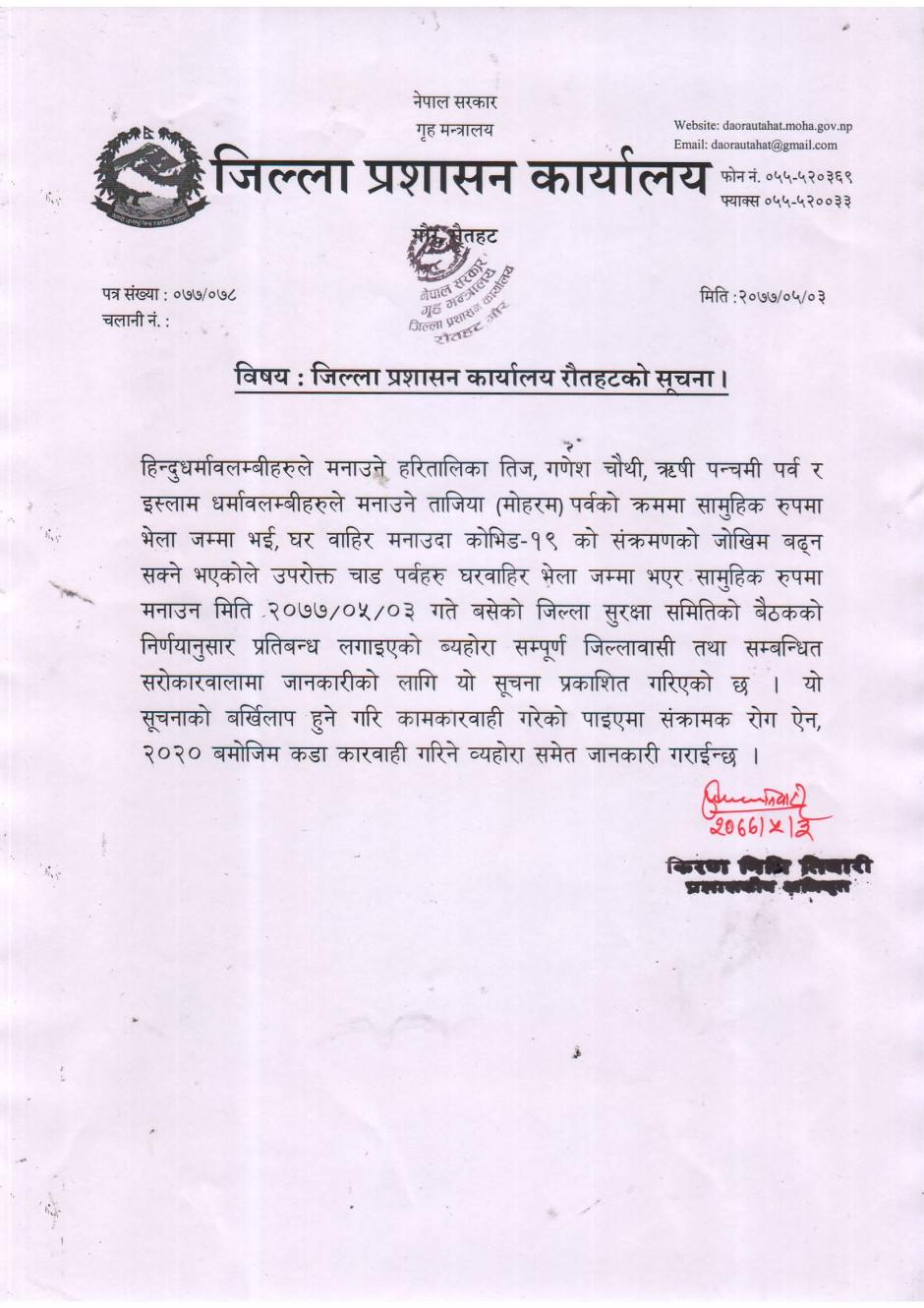 जिल्ला प्रशासन कार्यालय रौतहटबाट जारी सूचना