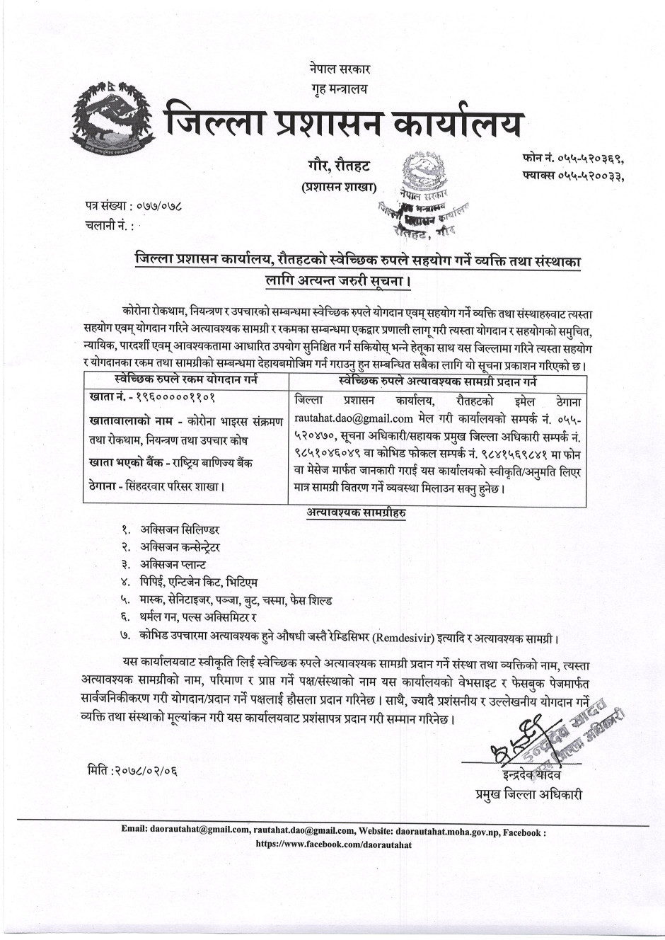 जिल्ला प्रशासन कार्यालय, रौतहटको स्वेच्छिक रुपले सहयोग गर्ने व्यक्ति तथा संस्थाका लागि अत्यन्त जरुरी सूचना ।