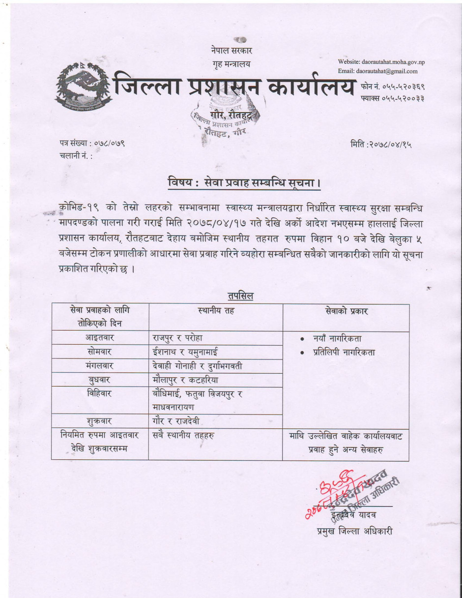 जिल्ला प्रशासन कार्यालय रौतहटको सेवा प्रवाह सम्बन्धी सूचना ।