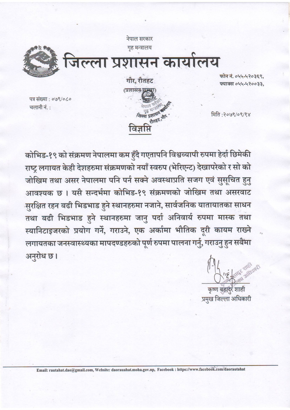 जिल्ला प्रशासन कार्यालय, रौतहटको विज्ञप्ति