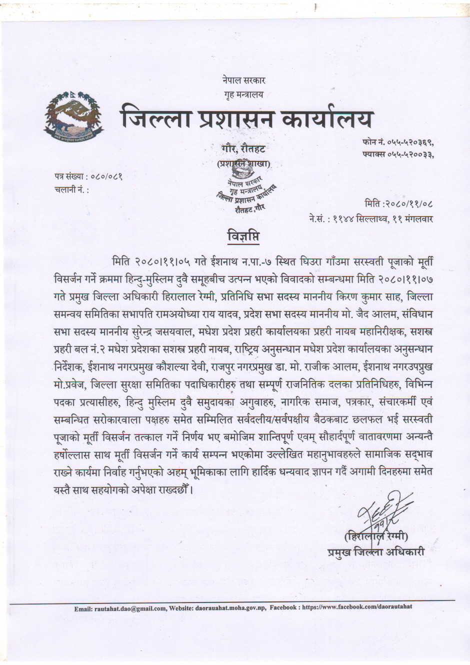 जिल्ला प्रशासन कार्यालय रौतहटको विज्ञप्ति