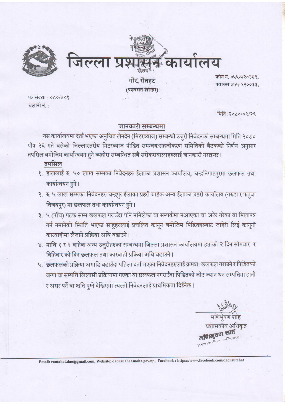 जिल्ला प्रशासन कार्यालय रौतहटबाट जारी सूचना