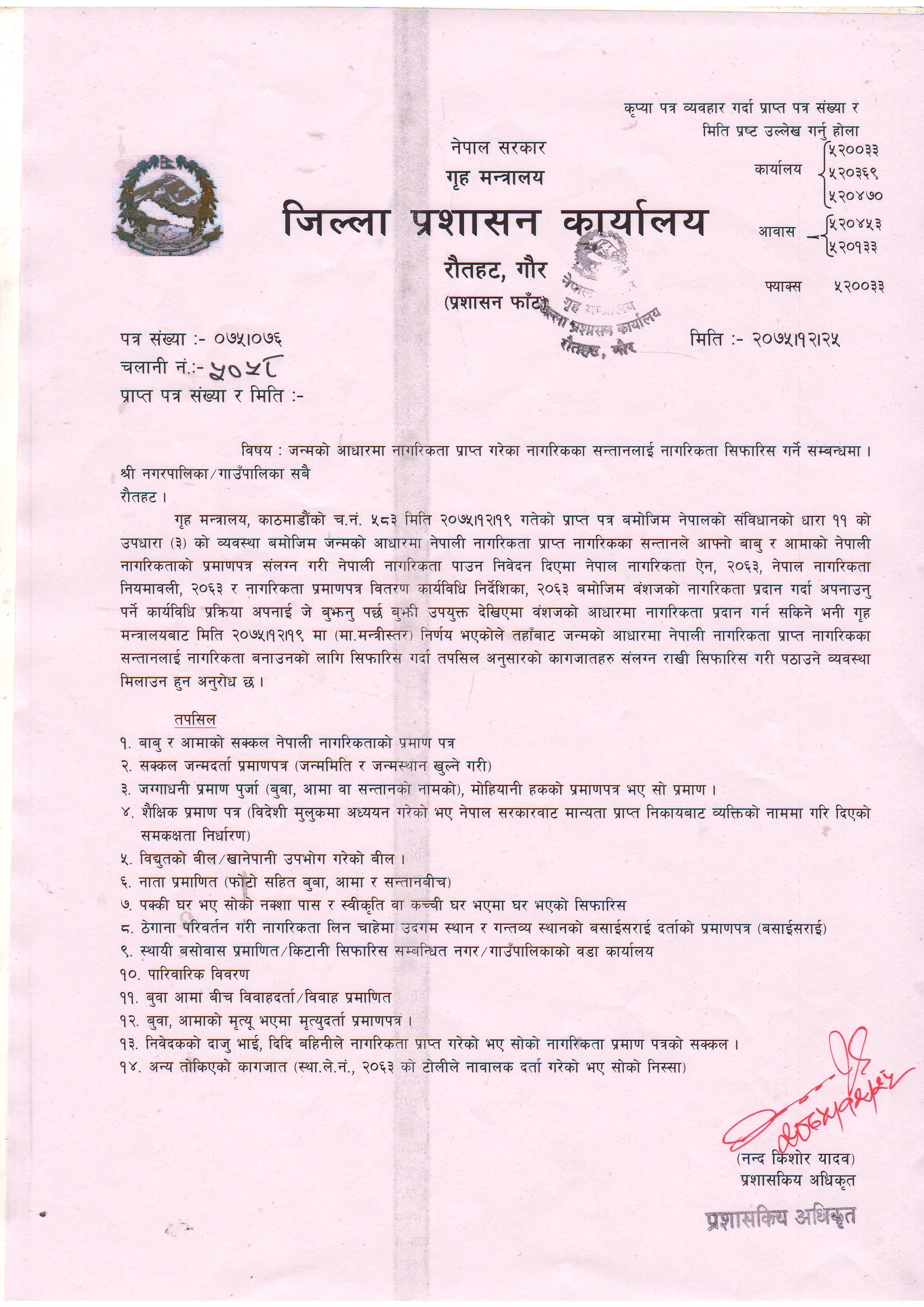 जन्मकाे आधारमा नागरिकता प्राप्त गरेका नागरिकका सन्तानलाइ नागरिकता सिफारिस गर्ने सम्बन्धमा