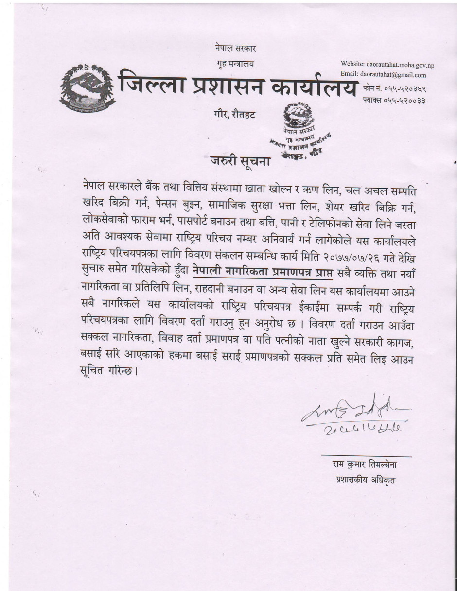 जिल्ला प्रशासन कार्यालय रौतहटबाट जारी सूचना