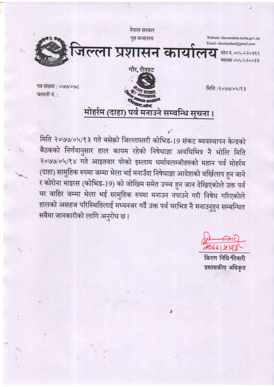 मोहर्रम (दाहा) पर्व मनाउने सम्बन्धि सूचना ।