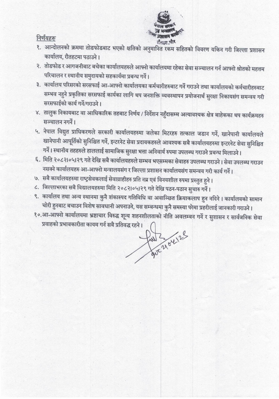 मिति २०८२।०५।२९ गते बसेको रौतहट जिल्लास्थित कार्यालय प्रमुखको बैठकको निर्णयहरु