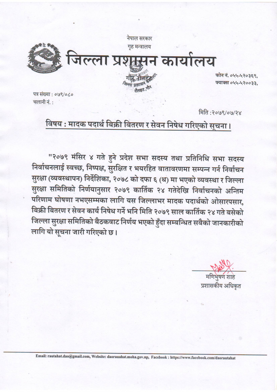 जिल्ला प्रशासन कार्यालय रौतहटबाट जारी सूचना