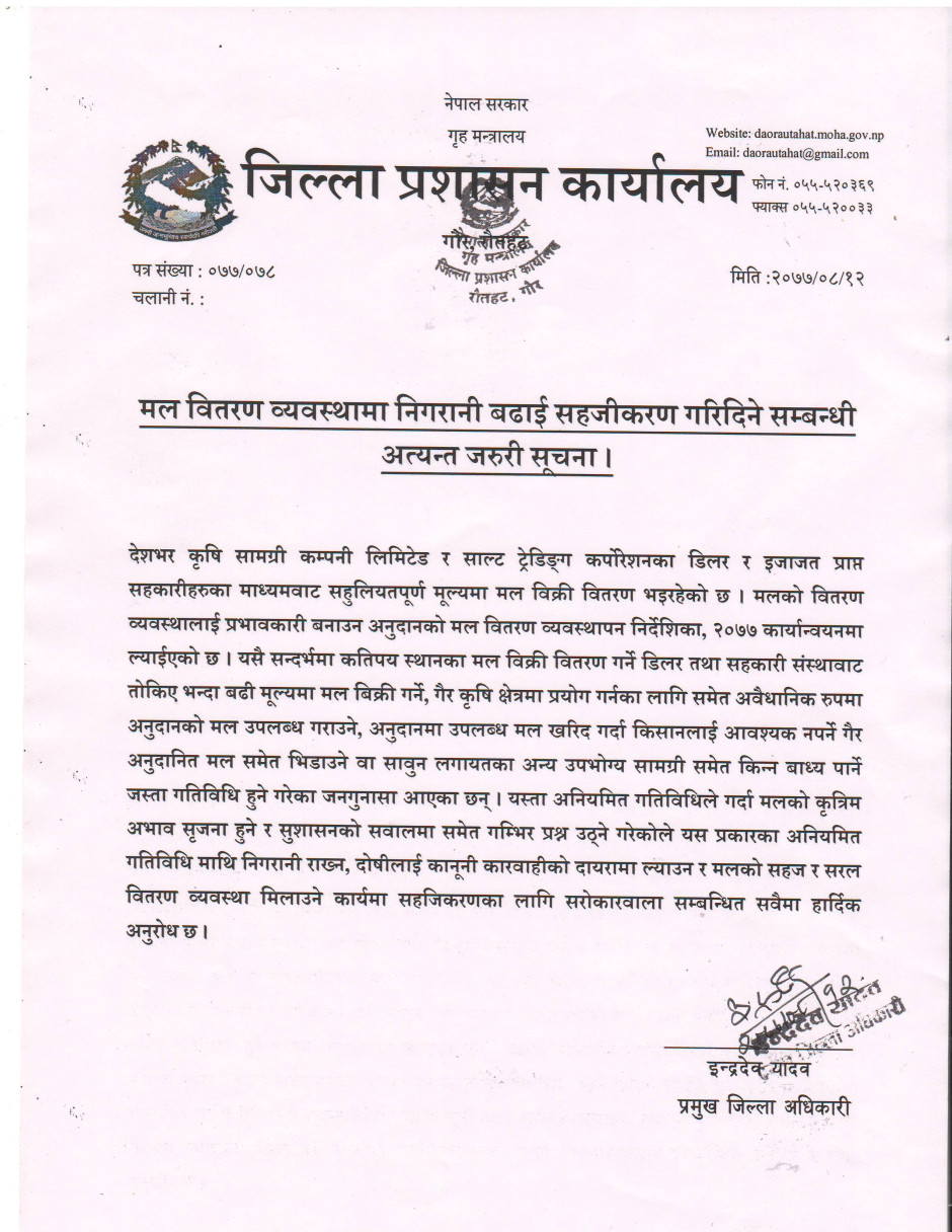 मल वितरण व्यवस्थामा निगरानी बढाई सहजीकरण गरिदिने सम्बन्धी अत्यन्त जरुरी सूचना ।