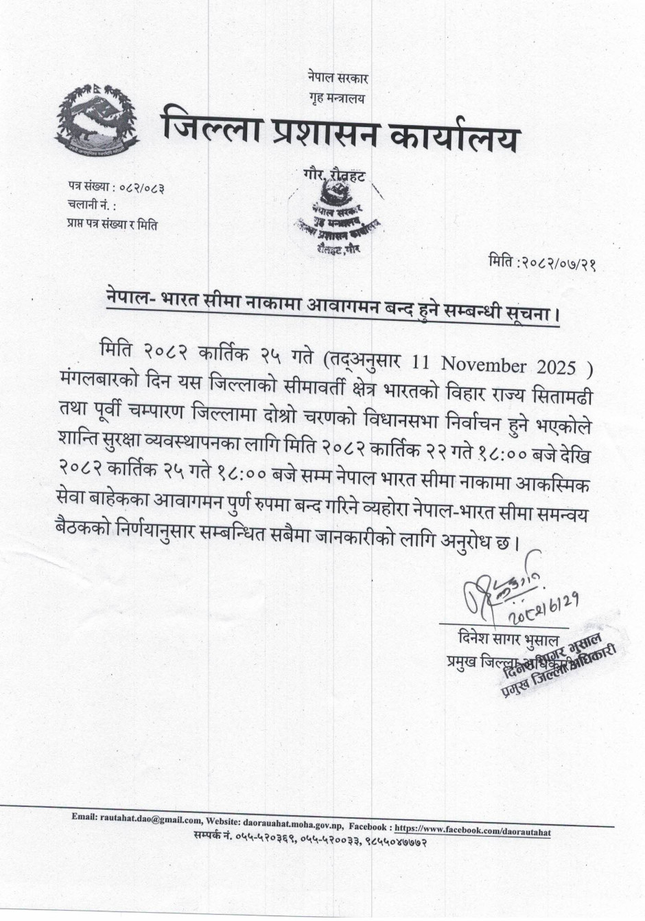 जिल्ला प्रशासन कार्यालय रौतहटबाट जारी सूचना