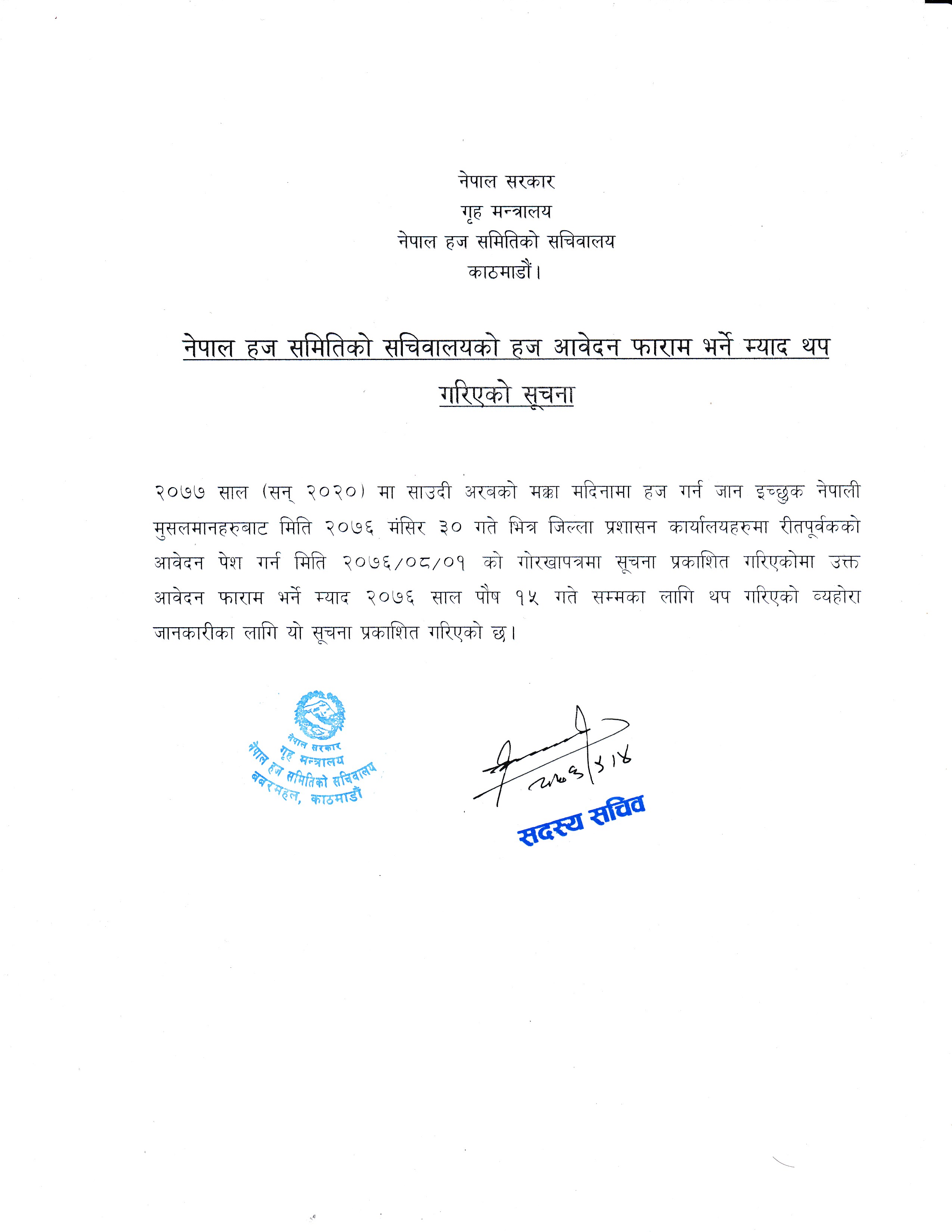 नेपाल हज समितिको सचिवालयको हज आवेदन फाराम भर्ने म्याद थप गरिएको सूचना