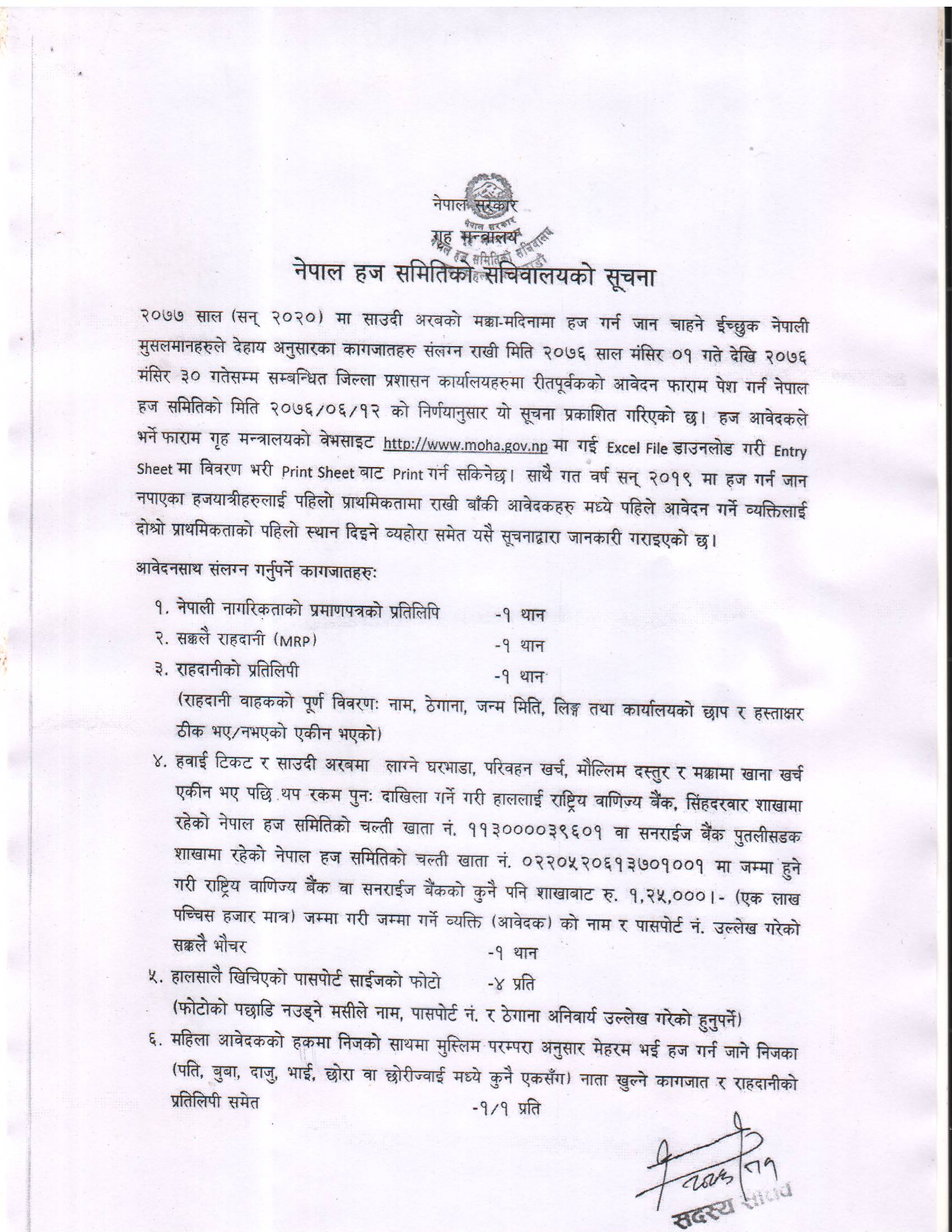 २०७७ साल (सन् २०२०) मा साउदी अरबको मक्का-मदिनामा हज गर्न जान चाहने ईच्छुक नेपाली मुसलमानहरुले देहाय अनुसारका कागजातहरु संलग्न राखी मिति २०७६ साल मंसिर ०१ गते देखि २०७६ मंसिर ३० गतेसम्म सम्बन्धित जिल्ला प्रशासन कार्यालयहरुमा रीतपूर्वकको आवेदन फाराम पेश गर्न नेपाल हज समितिको मिति २०७६/०६/१२ को निर्णयानुसार यो सूचना प्रकाशित गरिएको छ। थप जानकारीका लागि तलको सूचना हेर्नु होला ।