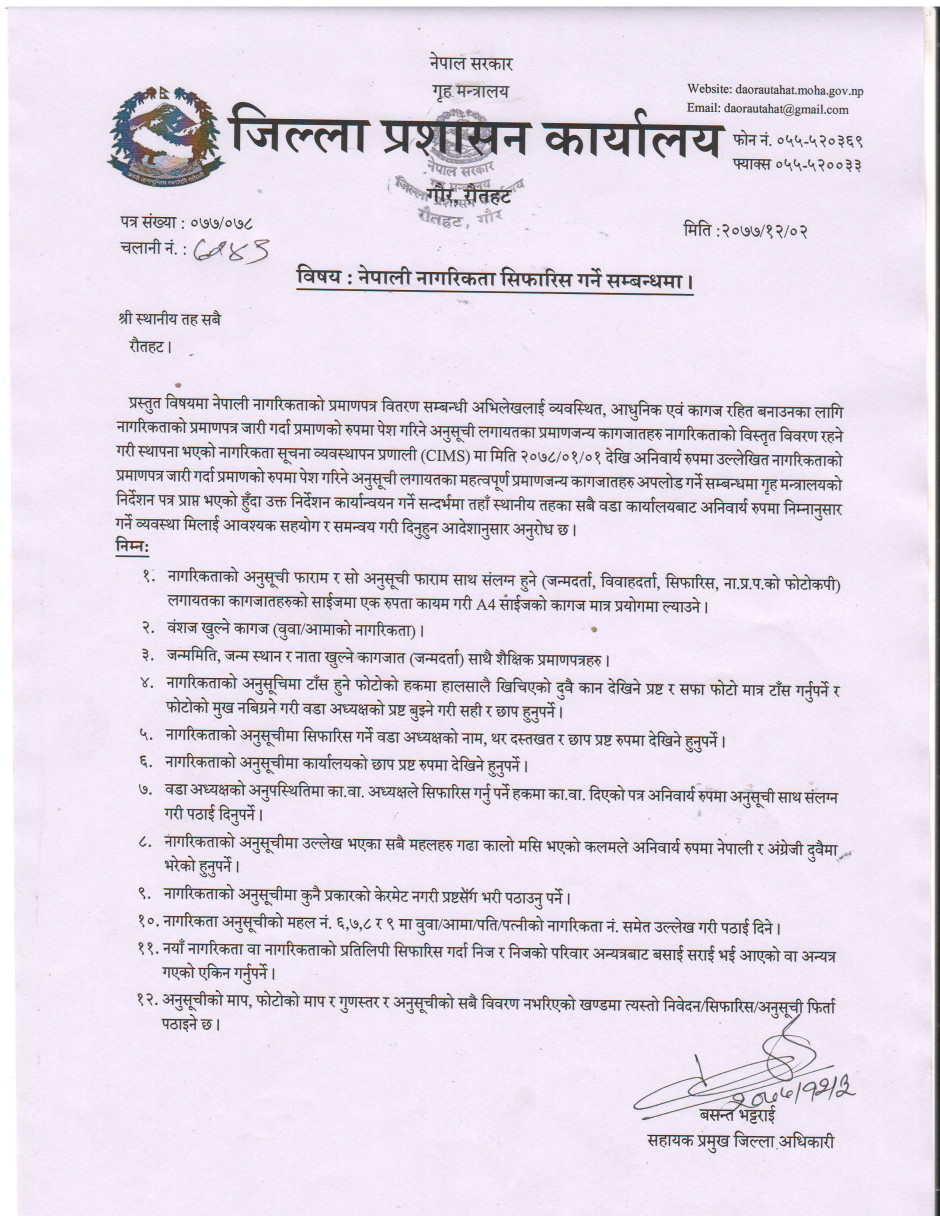 नेपाली नागरिकता सिफारिस गर्ने सम्बन्धमा