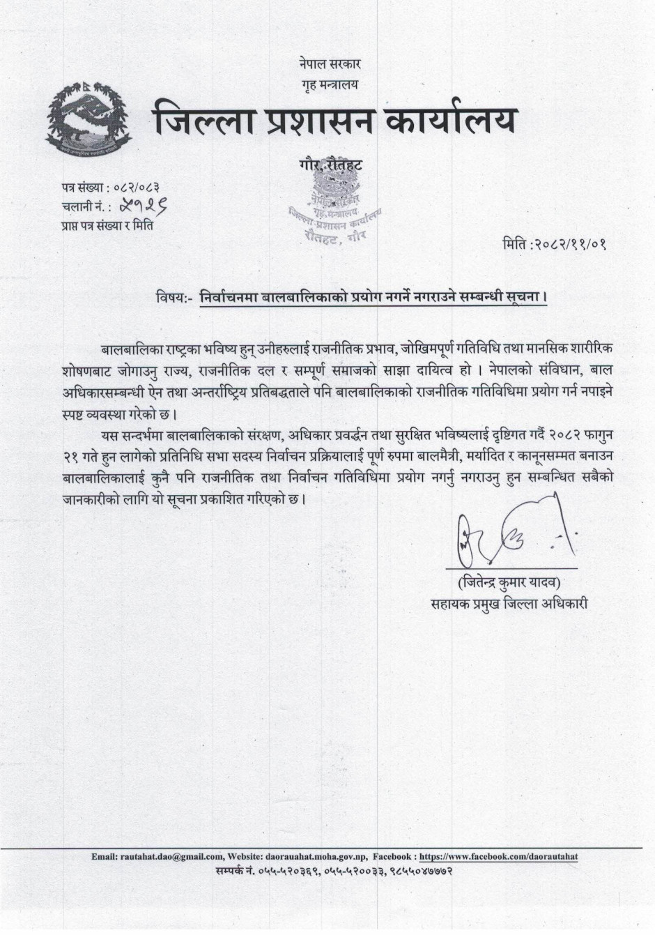 निर्वाचनमा बालबालिकाको प्रयोग नगर्ने नगराउने सम्बन्धी सूचना ।