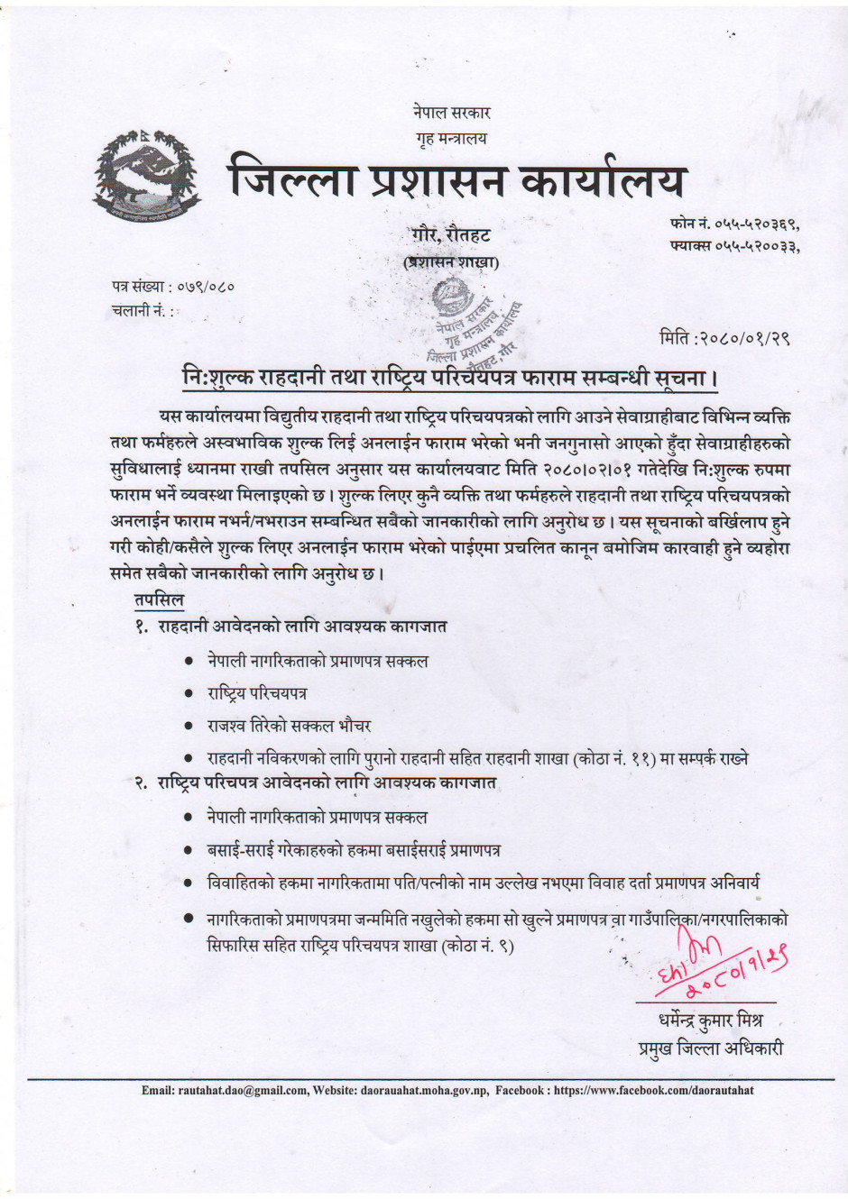 नि:शुल्क राहदानी तथा राष्ट्रिय परिचयपत्र फाराम सम्बन्धी सूचना ।