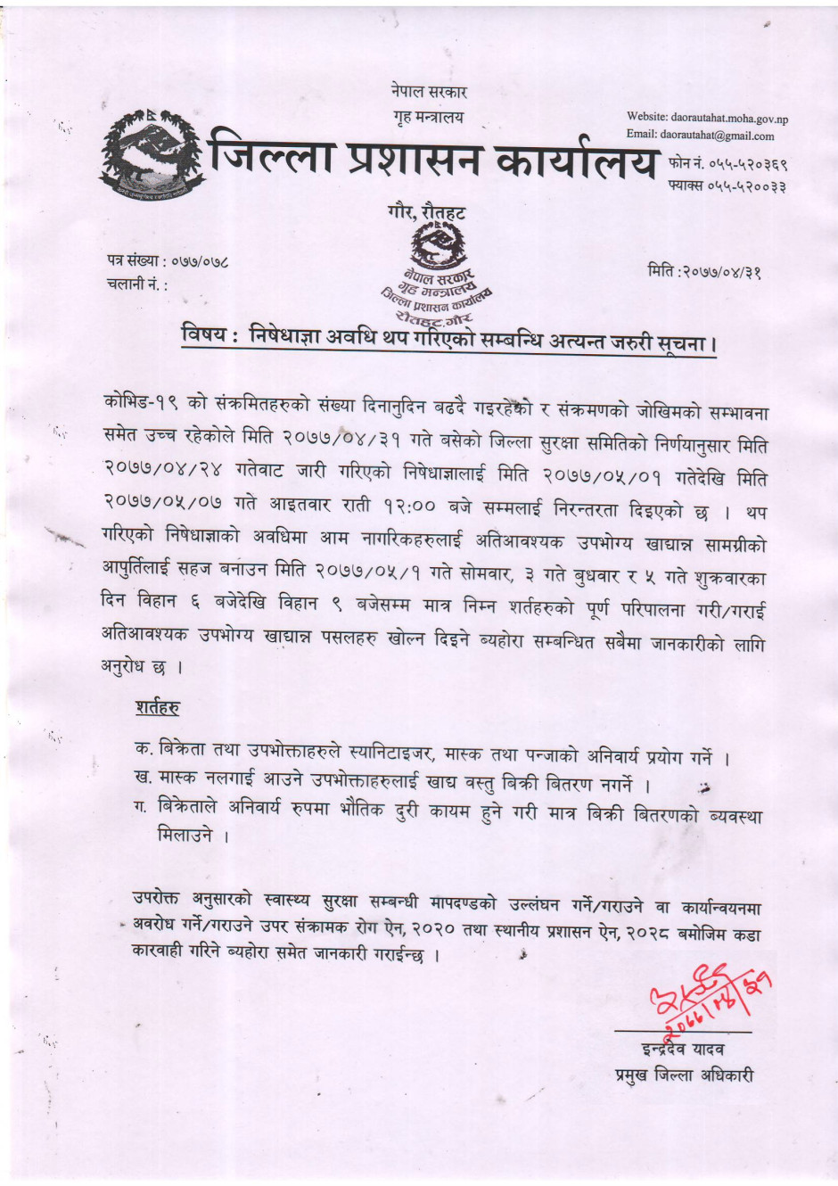 निषेधाज्ञा अवधि थप गरिएको सम्बन्धि अत्यन्त जरुरी सूचना ।