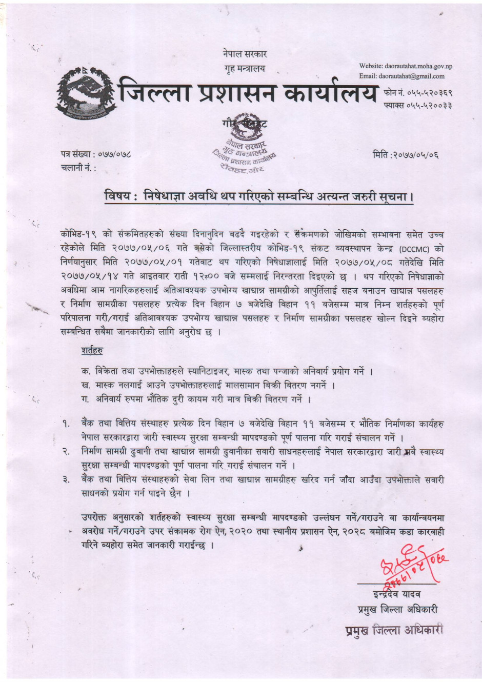 निषेधाज्ञा अवधि थप गरिएको सम्बन्धि अत्यन्त जरुरी सूचना ।