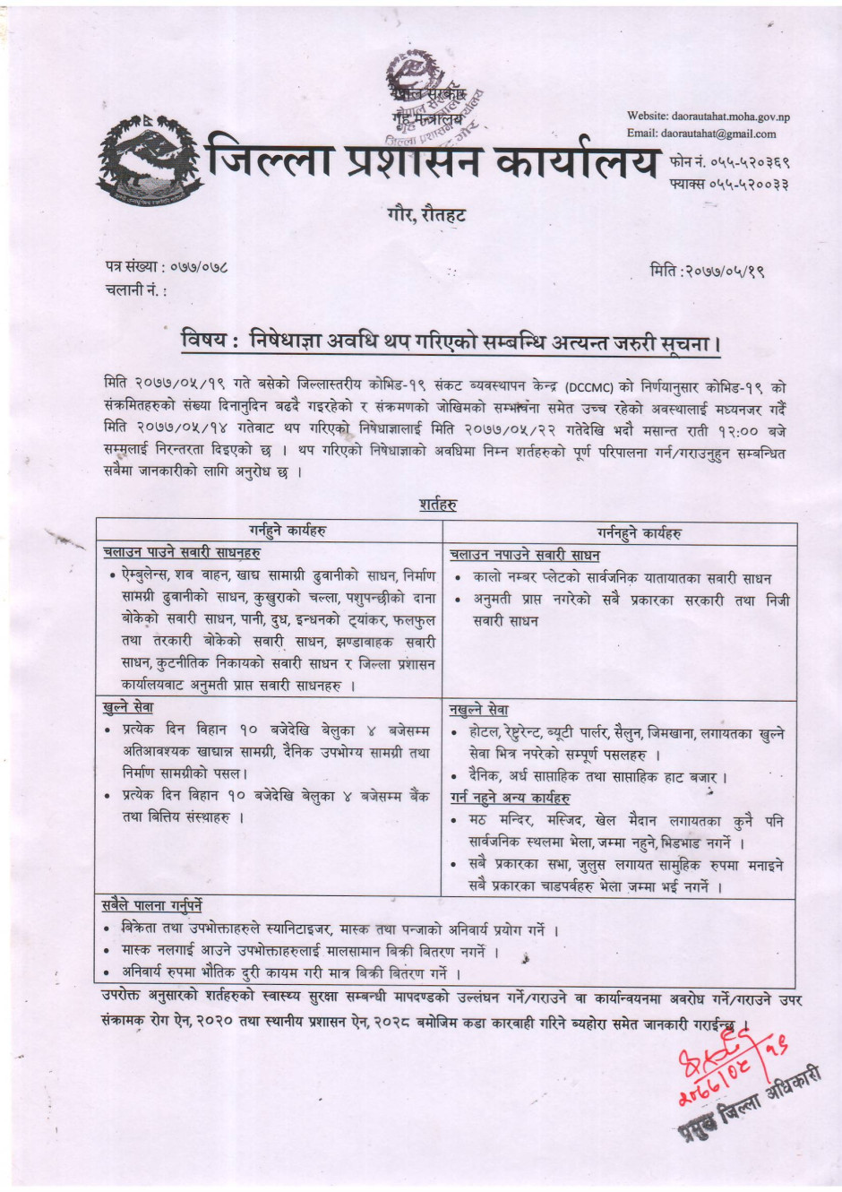 निषेधाज्ञा अवधि थप गरिएको सम्बन्धि अत्यन्त जरुरी सूचना ।