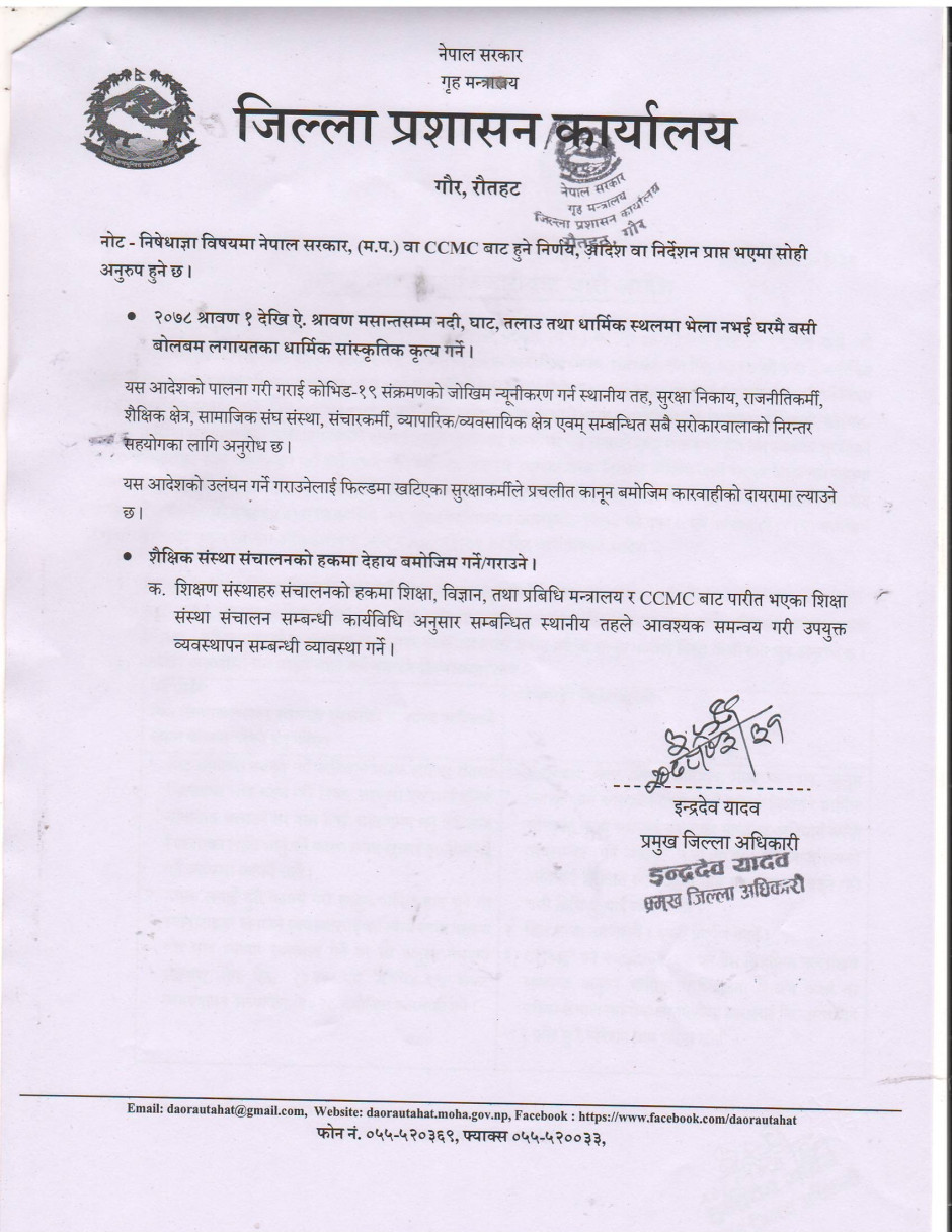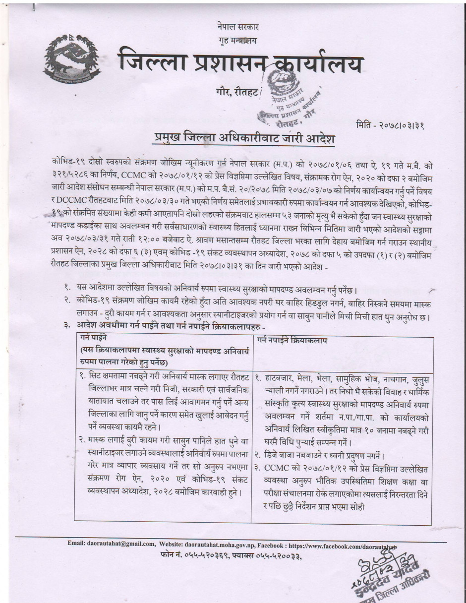 निषेधाज्ञा निरन्तरता सम्बन्धी प्र.जि.अ.बाट जारी आदेश, रौतहट