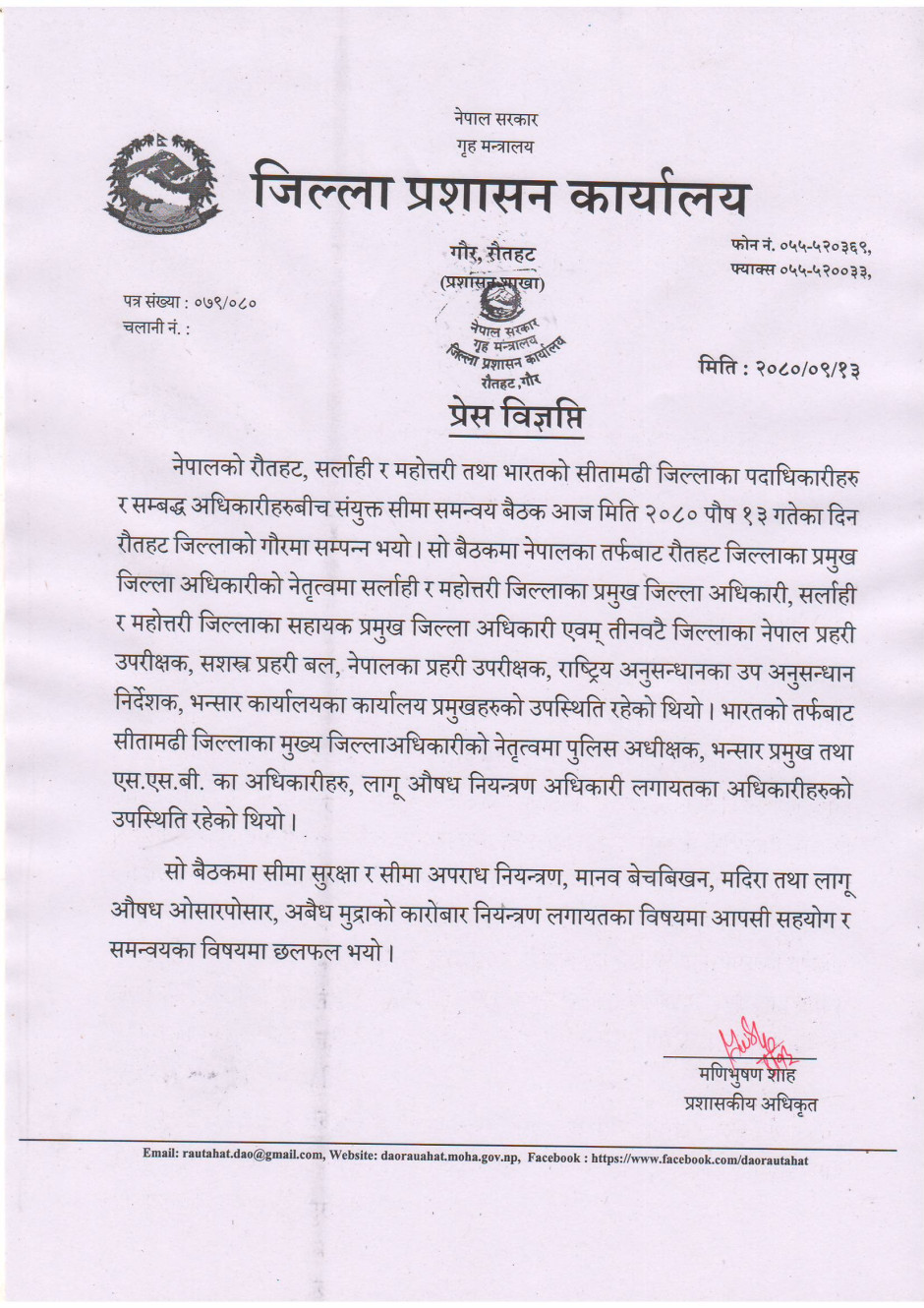 जिल्ला प्रशासन कार्यालय रौतहटको विज्ञप्ति