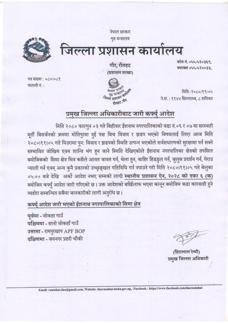 जिल्ला प्रशासन कार्यालय रौतहटबाट जारी सूचना