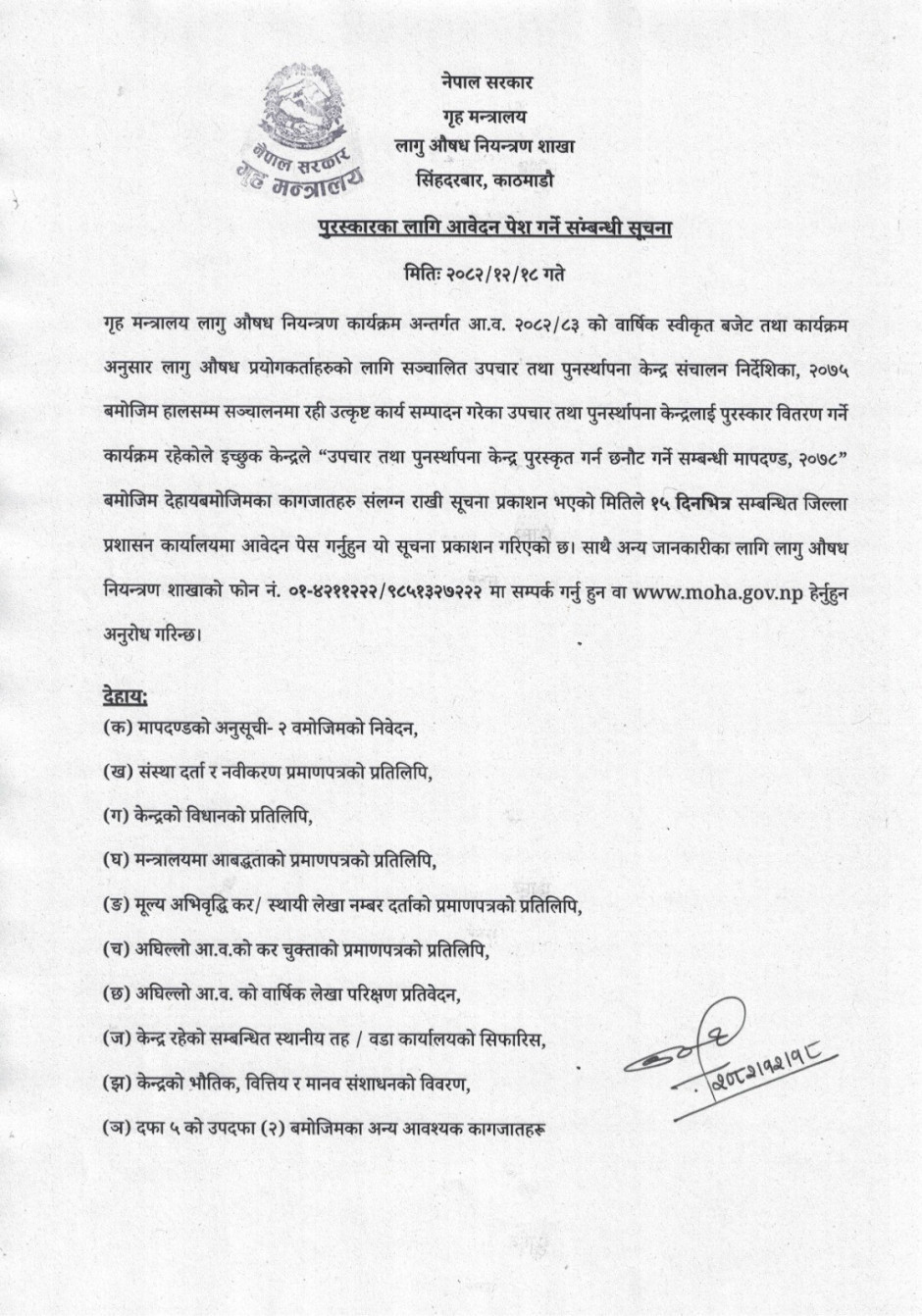 पुरस्कारको लागि आवेदन पेश गर्ने सम्बन्धी सूचना