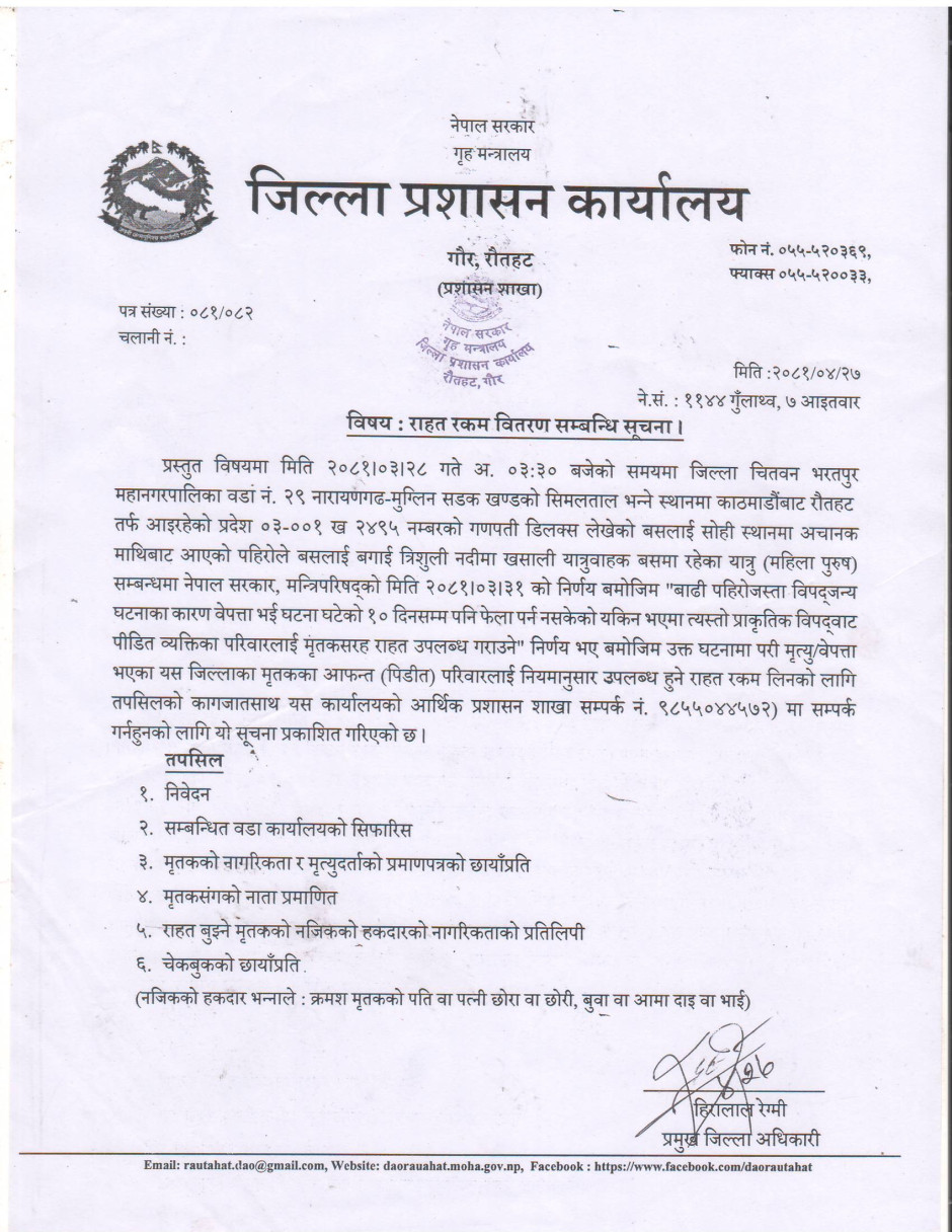 जिल्ला प्रशासन कार्यालय रौतहटबाट जारी सूचना