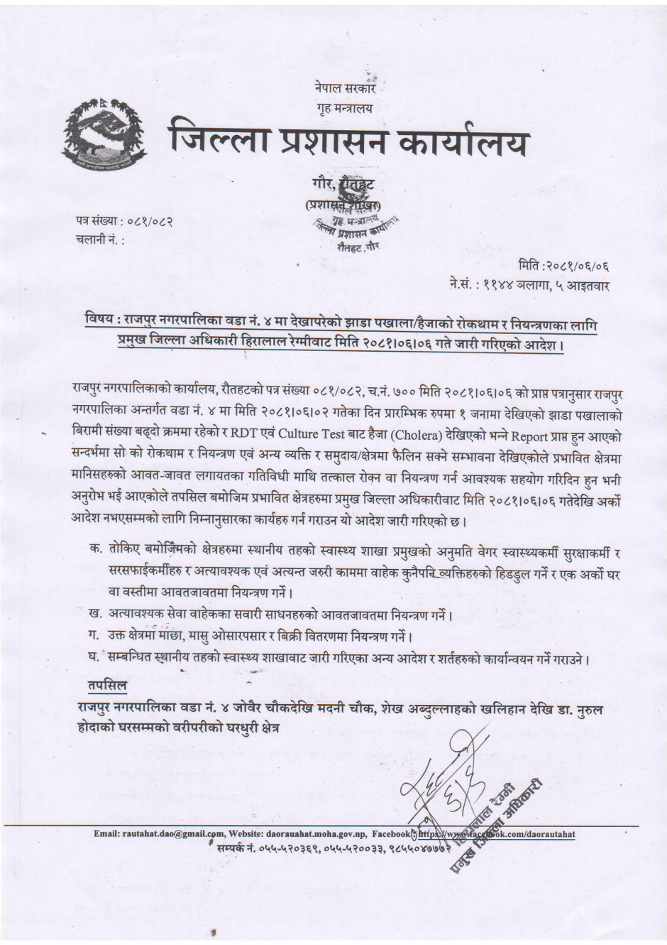 राजपुर नगरपालिका वडा नं. ४ मा देखापरेको झाडा पखाला/हैजाको रोकथाम र नियन्त्रणका लागि प्रमुख जिल्ला अधिकारी हिरालाल रेग्मीवाट मिति २०८१।०६।०६ गते जारी गरिएको आदेश