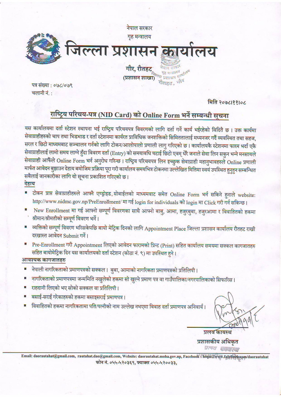 जिल्ला प्रशासन कार्यालय रौतहटबाट जारी सूचना