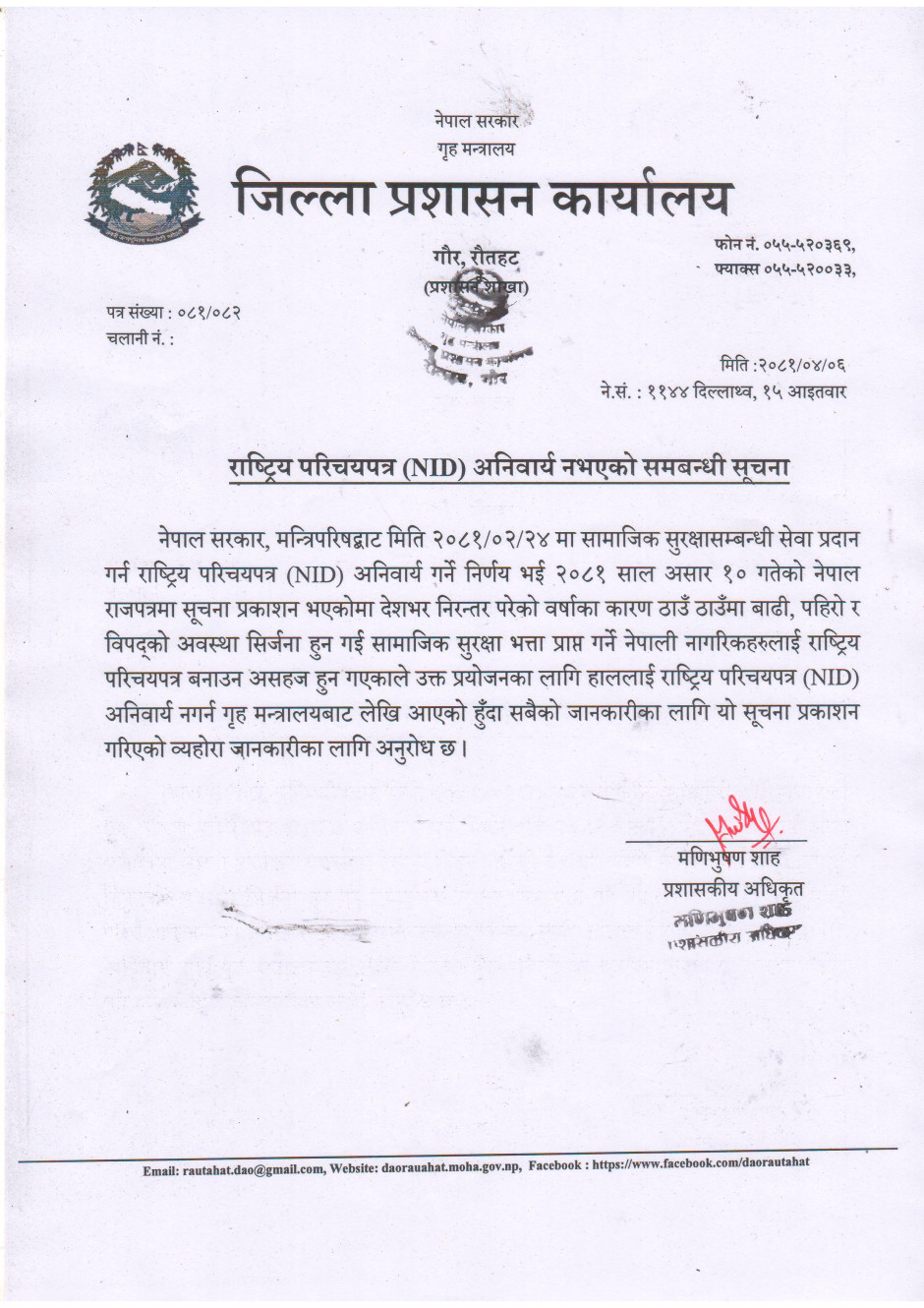 जिल्ला प्रशासन कार्यालय रौतहटबाट जारी सूचना