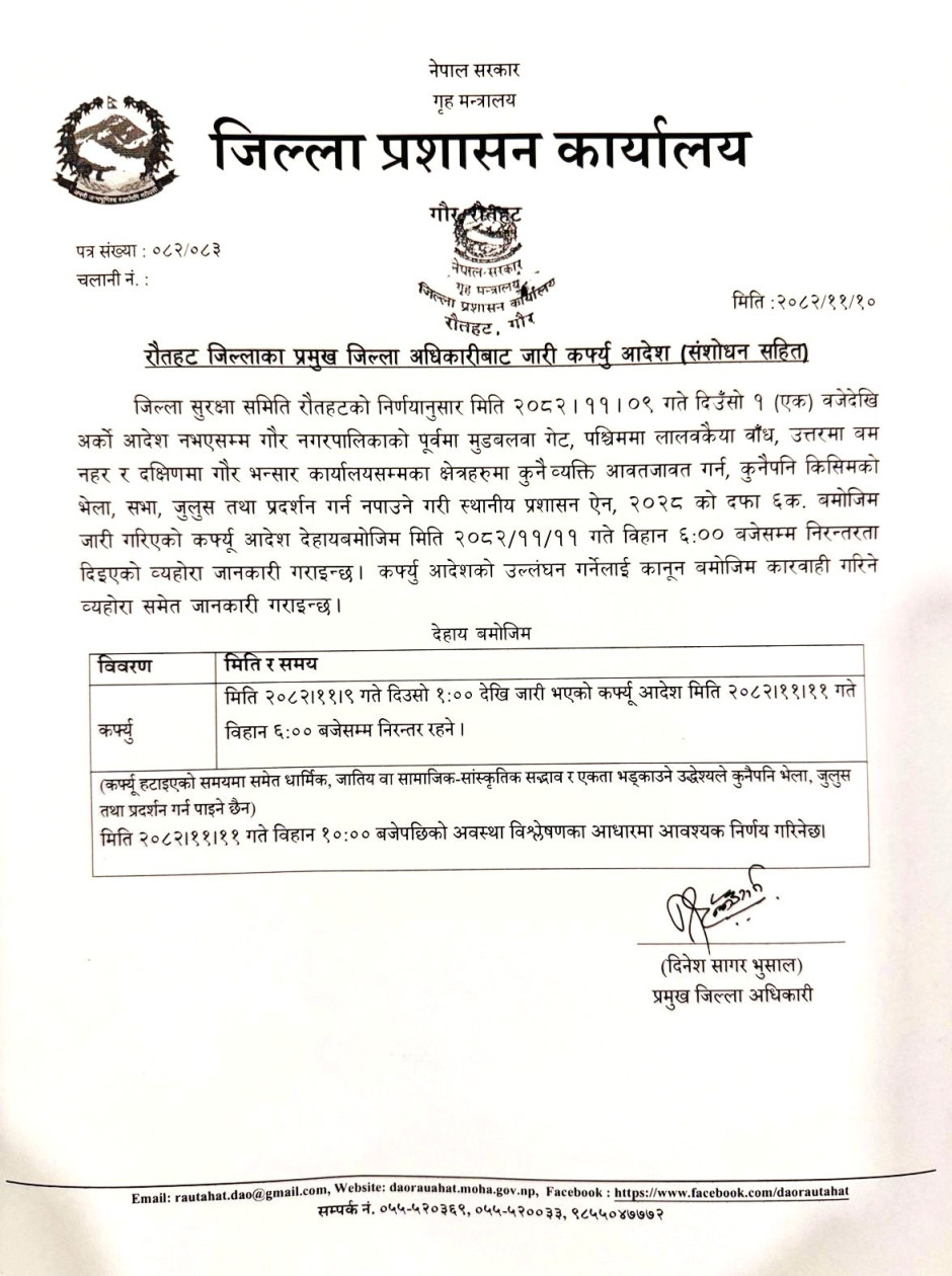 रौतहट जिल्लाका प्रमुख जिल्ला अधिकारीबाट जारी कर्फ्यु आदेश (संशोधन सहित)