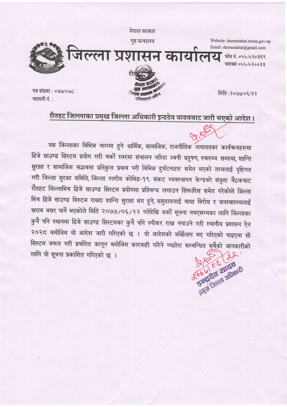 रौतहट जिल्लाका प्रमुख जिल्ला अधिकारी इन्द्रदेव यादवबाट जारी भएको आदेश ।