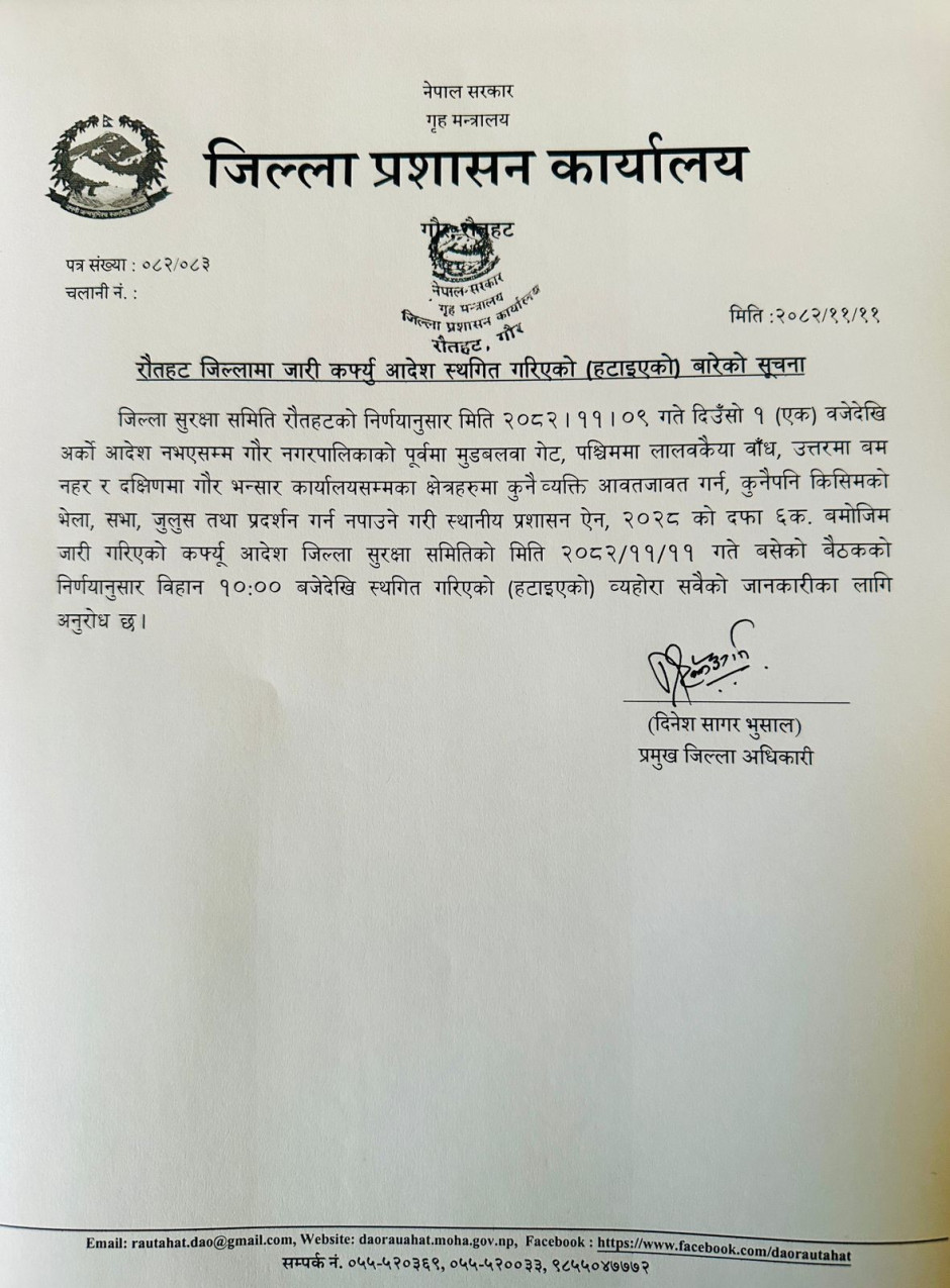 रौतहट जिल्लामा जारी कर्फ्यू आदेश स्थगित गरिएको (हटाइएको) बारेको सूचना