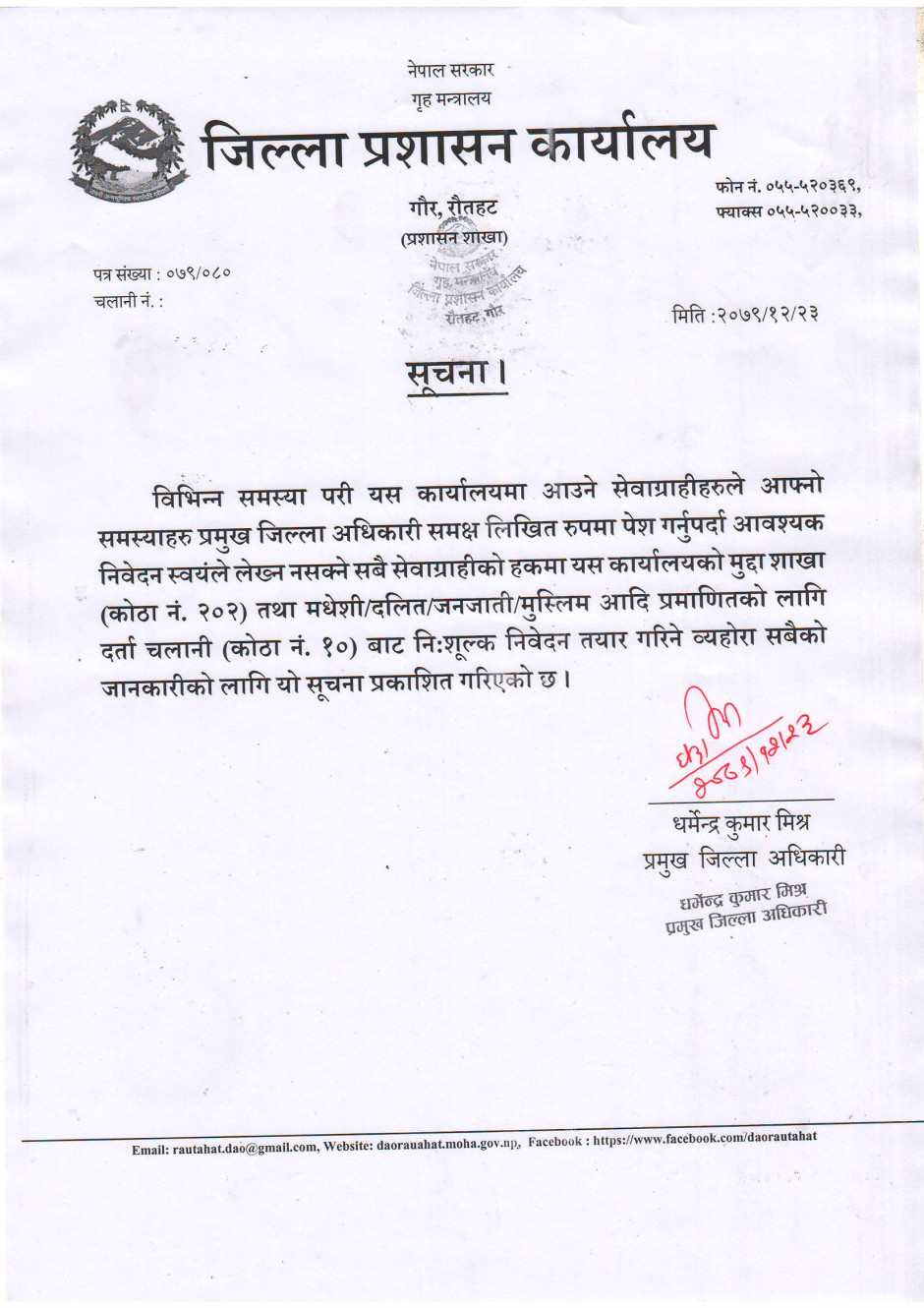 जिल्ला प्रशासन कार्यालय रौतहटबाट जारी सूचना