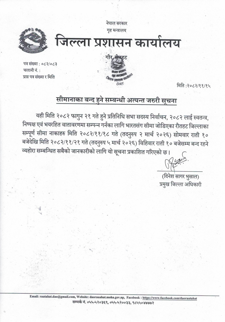 सीमानाका बन्द हुने सम्बन्धी अत्यन्त जरुरी सूचना