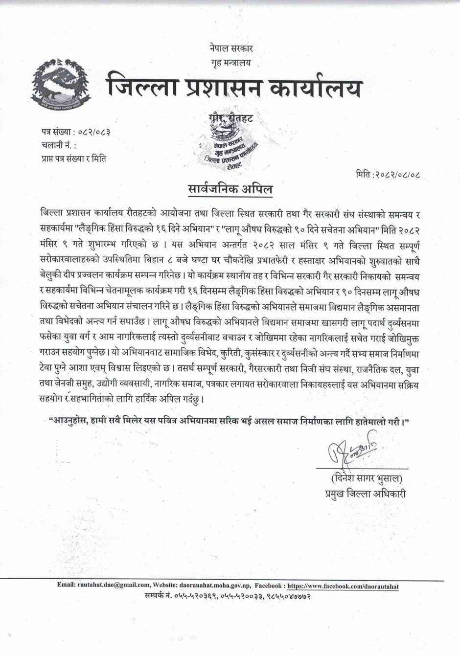 जिल्ला प्रशासन कार्यालय रौतहटबाट जारी सूचना