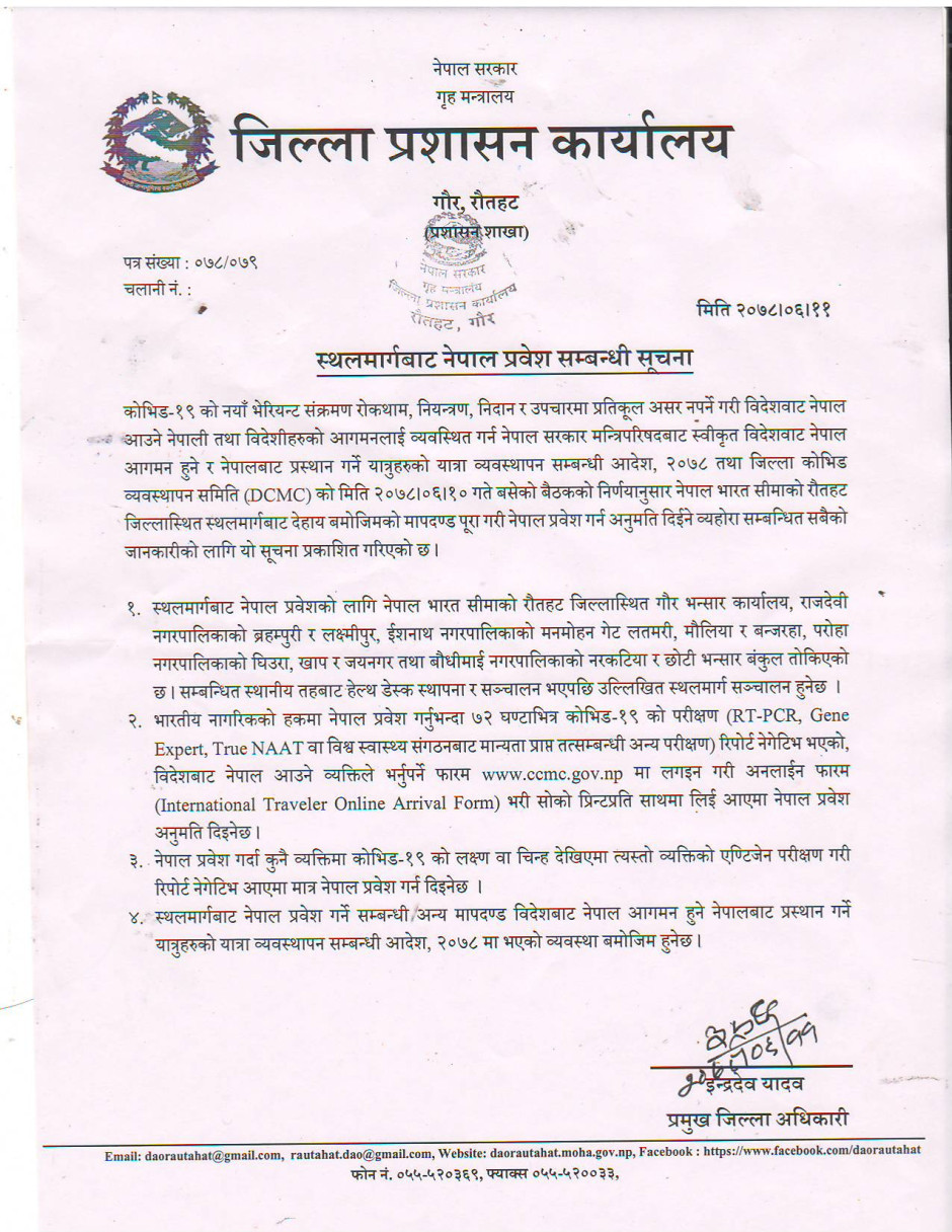 जिल्ला प्रशासन कार्यालय रौतहटबाट जारी सूचना