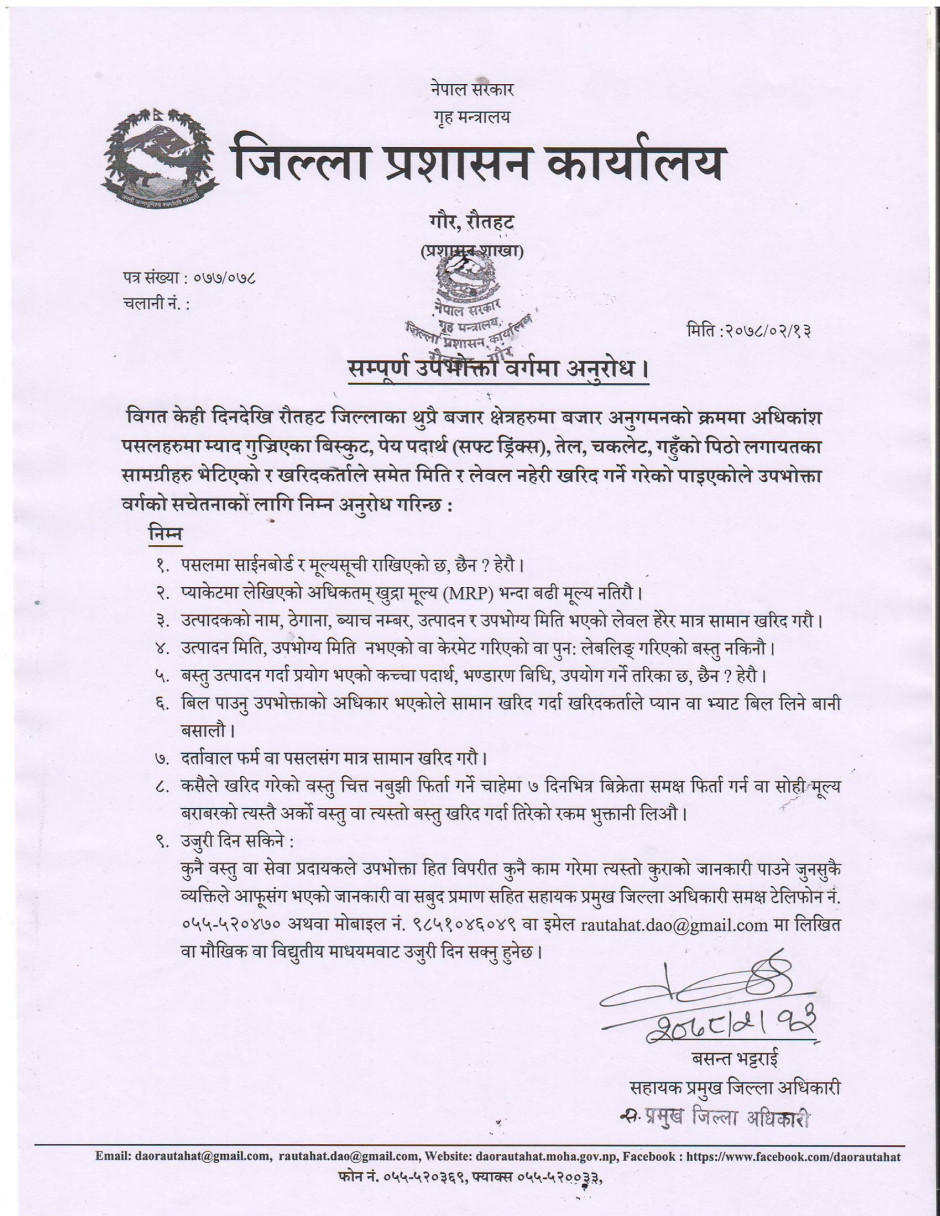 जिल्ला प्रशासन कार्यालय रौतहटबाट जारी सूचना