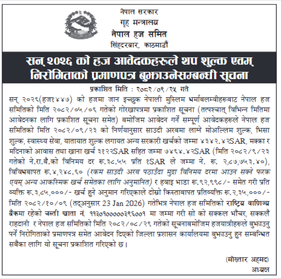 सन् २०२६ को हज शुल्क, राहदानी एवम् निरोगिताको प्रमाणपत्र बुझाउने सम्बन्धी सूचना