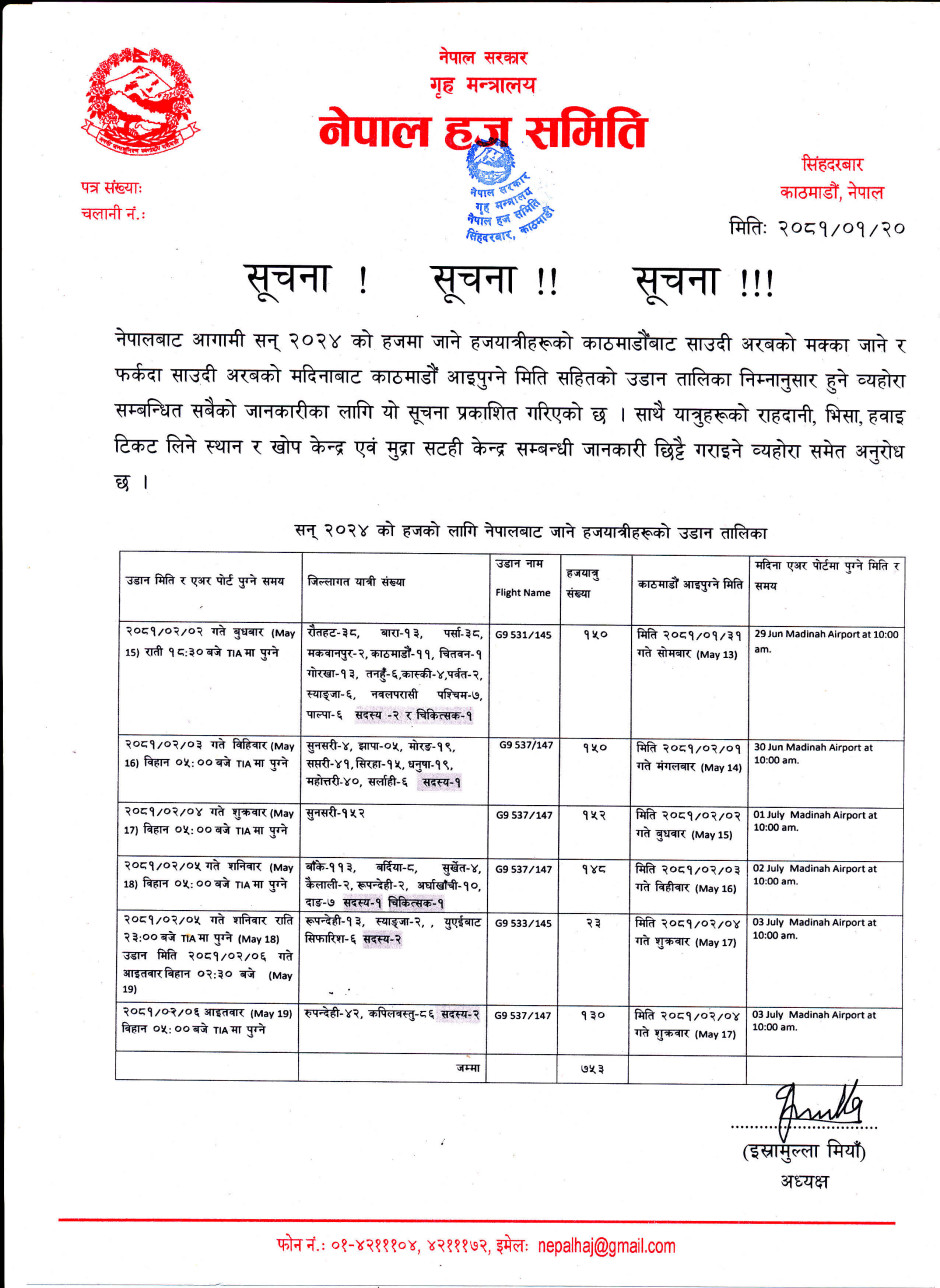 हजयात्रीहरुको उडान तालिका एवम् नामावलीको सूचना