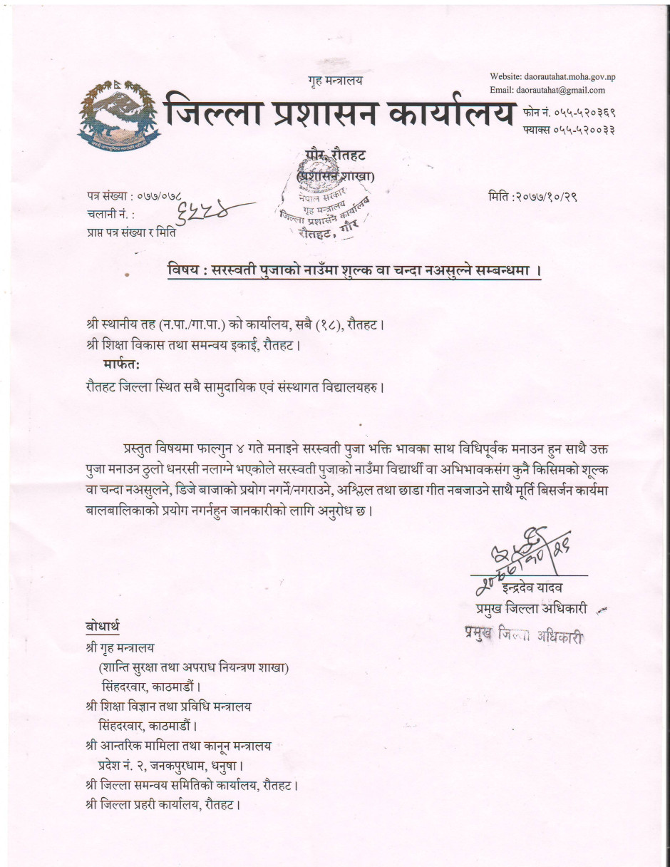 सरस्वती पुजाको नाउँमा शुल्क वा चन्दा नअसुल्ने सम्बन्धमा