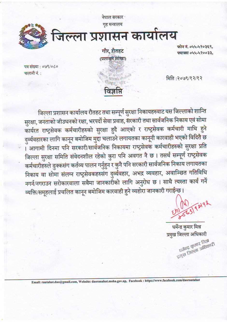 जिल्ला प्रशासन कार्यालय रौतहटको विज्ञप्ति